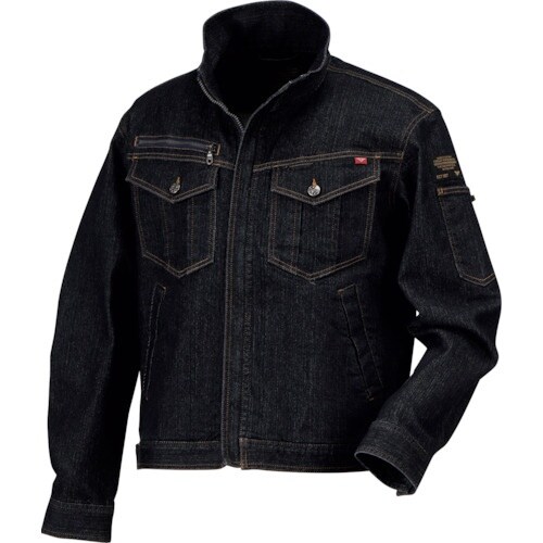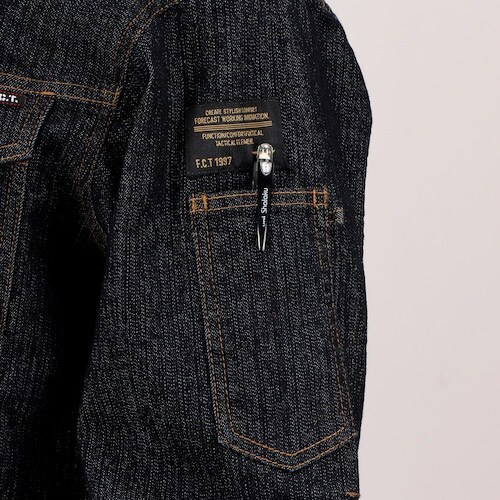 動きやすい伸縮性のある素材を使用したワークデニムブルゾンです。右胸のファスナーポケット、左胸・左袖にはペン挿しポケットを装備しています。