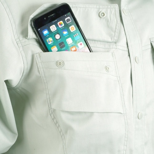 軽い着心地のツイル素材を使用した春夏向け長袖シャツです。<br>衿裏、脇下に消臭テープを取り付けています。<br>フロントがドットボタンで簡単に留められ着脱ラクラクです。一般作業全般に。