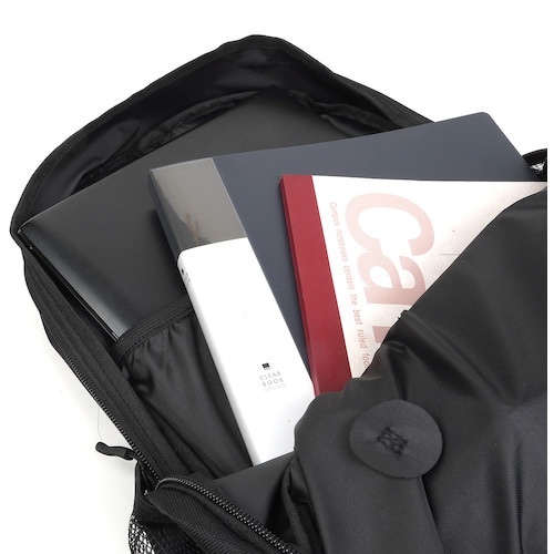 シューズを別ポケットに分けて収納可能なシューズinバッグ機能付きです。イヤホンケーブルやバッテリコードを通せるコードホールやバッテリーを収納できる内側ポケットを装備しています。