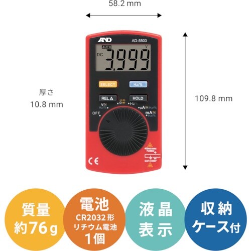 一般校正証明書付きです。3999カウント表示デジタルマルチメーターです。持ち運びやすいカードタイプ(厚さわずか10.8mm、重さ76g)で、テストリードがケースに収納可能です。 |