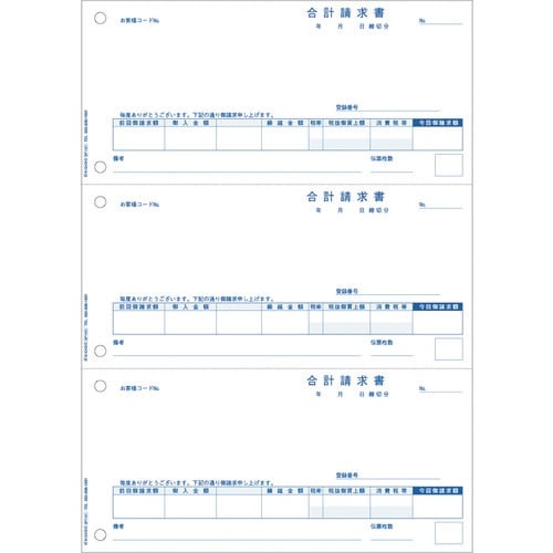 軽減税率制度に対応した、インボイスタイプの合計請求書です。必要項目をわかりやすく設計しています。クリアカットミシンで、簡単にキレイに切り離せます。 |