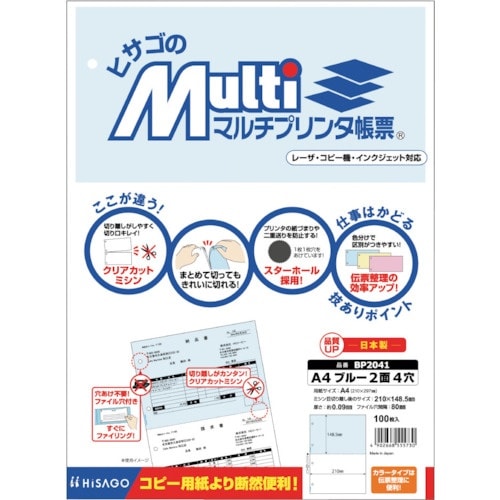 HISAGO マルチプリンタ帳票 A4 ブルー 2面 4穴 BP2041 1Pk(100枚)