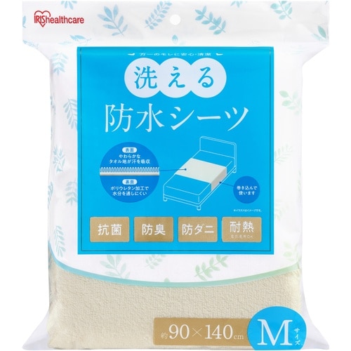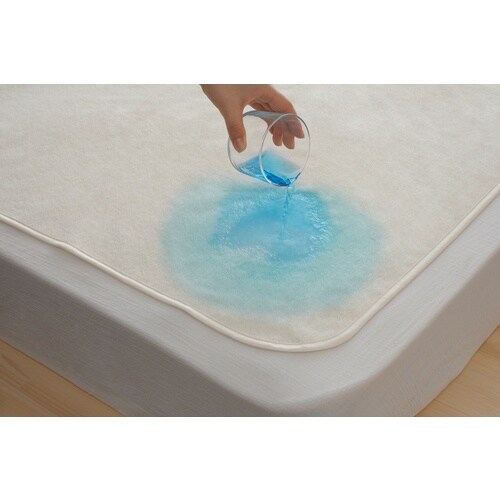 洗って繰り返し使えるタイプの防水シーツです。表面はやわらかなタオル地が汗を吸収します。裏面はポリウレタン加工で水分を通しにくくなっています。万一のモレや食べこぼしなどに安心な防水加工です。 |