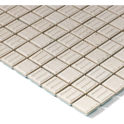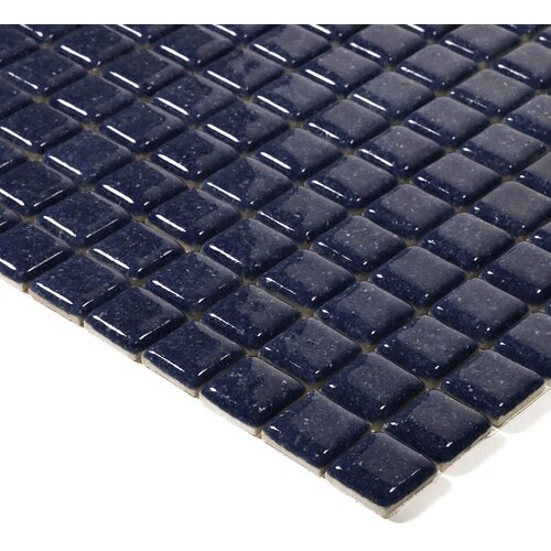 四辺のエッジが丸いガラスモザイクタイル。裏足付きで剥離しにくいガラスとタイルの2層構造です。角が丸くて水周りでも安心・安全です。プールタイルとしてのご使用も可能です。