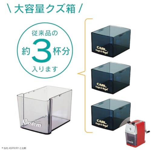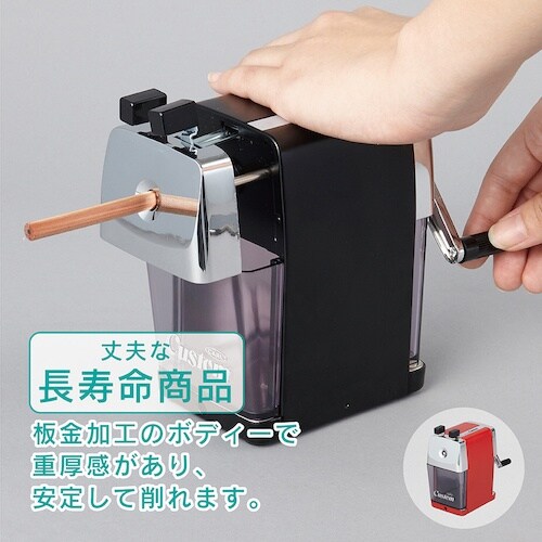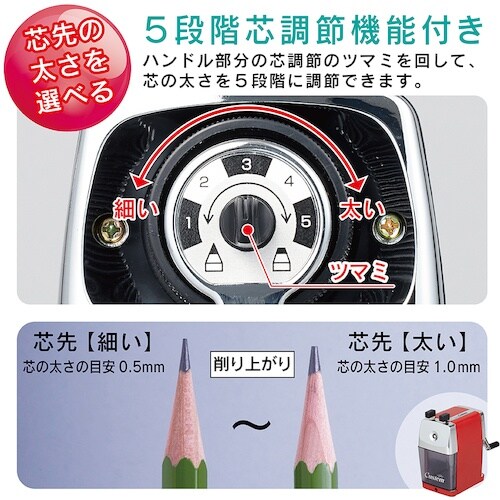大容量のくず受けは、削りくずを捨てる手間が少なく、学校や塾やオフィスなどで共有物としてもおすすめの商品です。芯の太さを選べる5段階芯調節機能付き(芯の太さの目安0.5mmから1.0mm)。