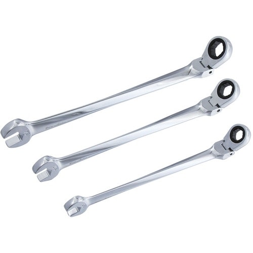 スパナ部、メガネ部ともにエクストラクター機能付きです。メガネ部はギア数72山(送り角5度)のギアを採用し、小気味よく回転します。また180度首振り機構付きで作業性抜群です。 |