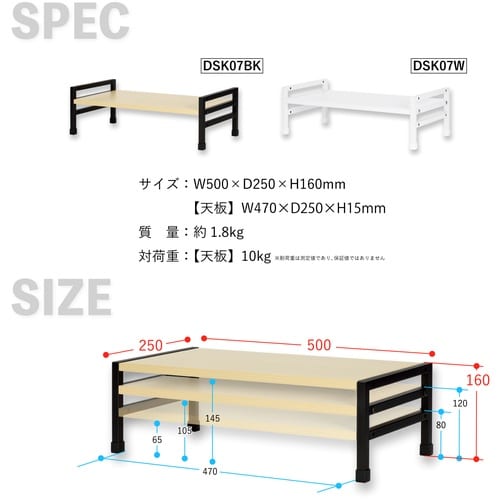 最大積載量(kg・台):10kg | 幅(mm):500 | 奥行(mm):250 | 高さ(mm):160 | 色:ブラック・木目 | 主な素材:合…