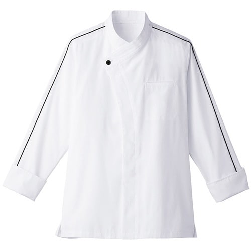同色のテープと釦のアクセントがスマートな印象に。ホワイトを基調としたコックコート型。