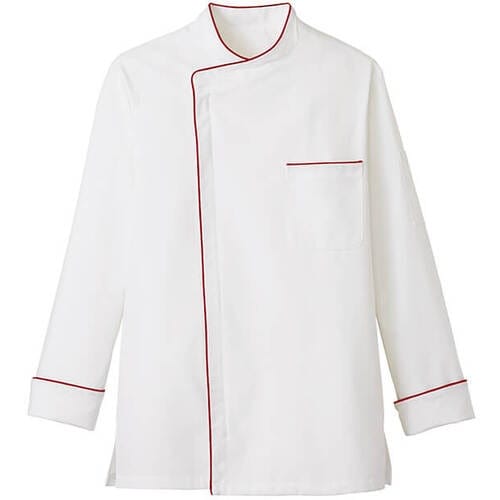 同色のテープと釦のアクセントがスマートな印象に。ホワイトを基調としたコックコート型。