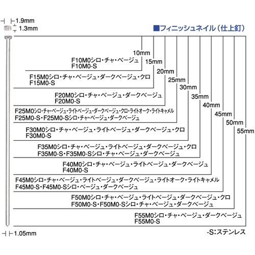 全8色の豊富なカラーバリエーションでサポートするフィニッシュネイルです。内装仕上げ。 |