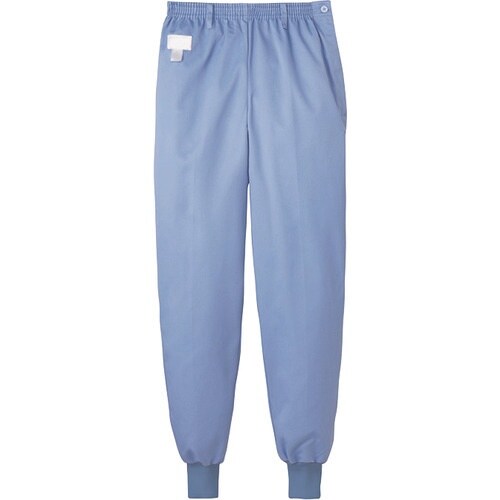 異物混入対策仕様のスタンダードの常温作業場向けホッピングパンツです。ウエスト総ゴム、左脇開きコイルファスナー、右後外ポケットです。