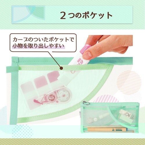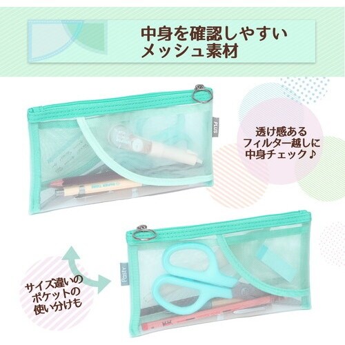 メッシュ素材で中身が透けて見えるケースです。筆記具と小物の持ち運び用に。