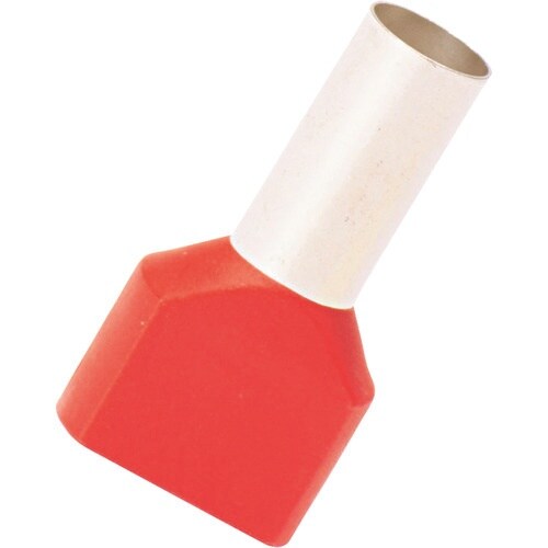 2本の電線を圧着するためのフェルール端子です。ポリプロピレン製の絶縁スリーブの色はドイツの規格(DIN)に準じています。ファネル挿入になっているため電線の挿入が簡単です。 |