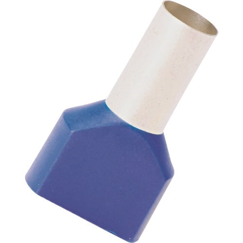 2本の電線を圧着するためのフェルール端子です。ポリプロピレン製の絶縁スリーブの色はドイツの規格(DIN)に準じています。ファネル挿入になっているため電線の挿入が簡単です。 |