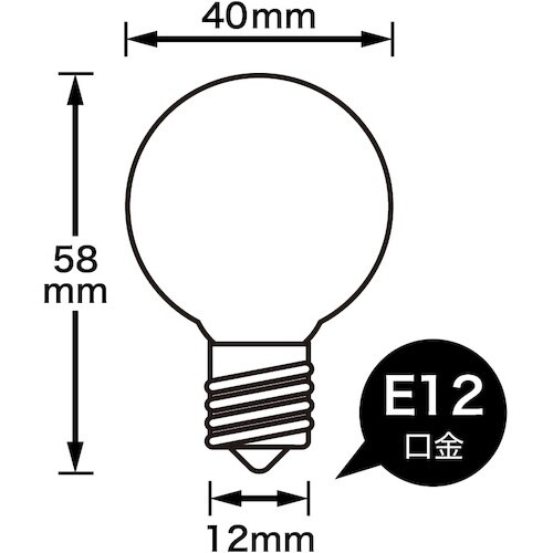 外径(mm):40 | 全長(mm):58 | 消費電力(W):5 | 口金:E12 | 定格寿命(時間):2000 | タイプ:ベビーボール球 | …