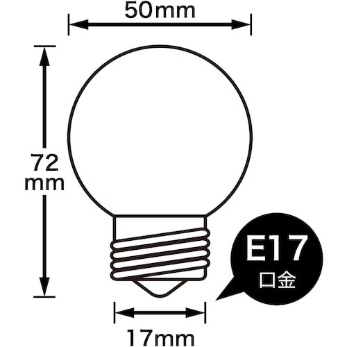 外径(mm):50 | 全長(mm):72 | 消費電力(W):60 | 口金:E17 | 定格寿命(時間):2000 | ガラス:クリア | 単位:…