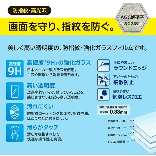 日本メーカー製ガラス使用。貼っていることを感じさせないほどの高い透明度。防指紋コーティング加工で、指紋や油、ほこりなどが付きにくい。液晶画面本来の滑らかな指すべりを実現します。 |
