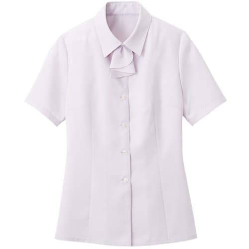 白×カラーの交織で上品な組織感を出しながら優しい印象の色味に仕上げた半袖ブラウス。台衿付きのシャツカラーだから、リボンを付けても第一ボタンを開けて着ても様になります。