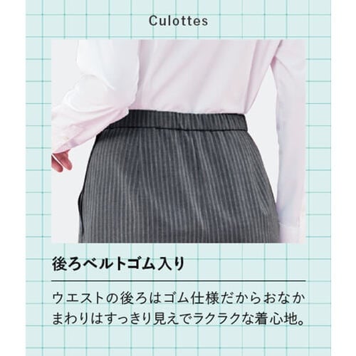 「明るいグレーベースにグレー+ピンクのライン」、または「紺ベースにグレー+ブルーのライン」を配した2色展開のベーシックで着こなしやすいストライプのキュロット。