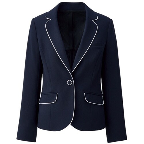上質感のあるネイビーの無地素材に清潔感のある白いパイピングの入ったジャケット。くるみボタンやポケット部分のビットの金属使いがアクセント。 |