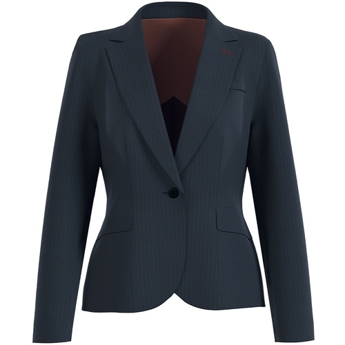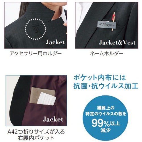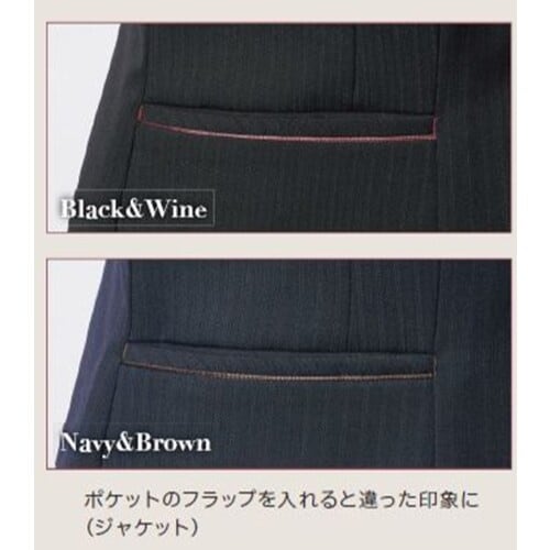 黒にはワイン系、紺にはブルー系の差し色のラインがさりげなく入ったストライプ柄。スッキリシャープなシルエットのジャケット。
