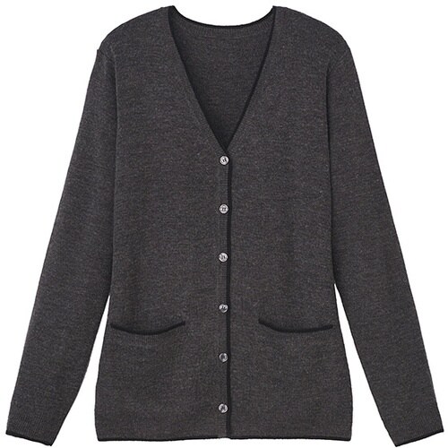 衿ぐりから前端、ポケット口に配したラインがアクセントになっているカーディガン。着丈が長めなので安心感があります。 |