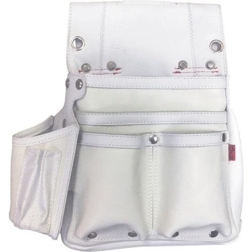 腰回りをスマートに演出、丈夫で機能的な釘袋のホワイトカラーの大サイズ+墨壷ケース付きモデル前面は白染めの牛革と合皮を使用し、背面は型崩れしにくい三層のPE材を使用。 |