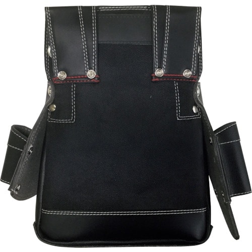 収納へのこだわりを追及、使えば納得、ハンマー・ラチェットホルダー付の本革釘袋前面は黒染めの牛黒革と合皮を使用し、背面は型崩れしにくい三層のPE材を使用。 |