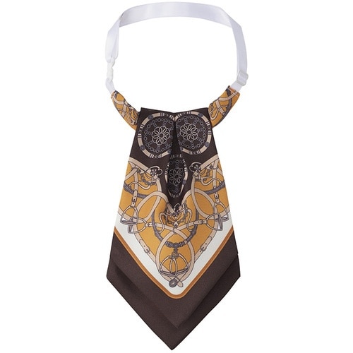 チェーンやベルトなどのモチーフを配したクラシカルなスカーフ柄のアスコット型のタイです。
