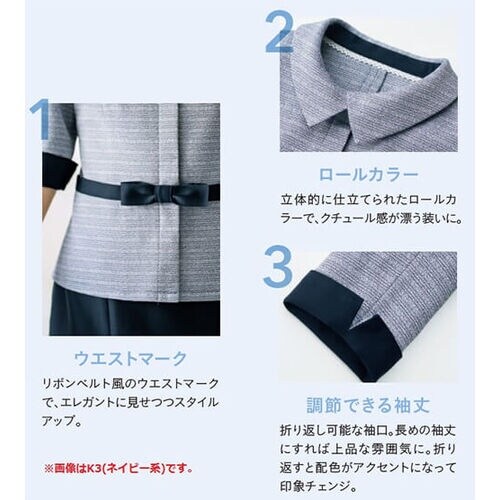 シルバーラメ入りボーダー柄のサマーツイードで、リボンと袖口は光沢感のある濃色生地を使った七分袖のオーバーブラウス。 |