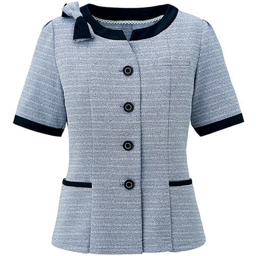 シルバーラメ入りのサマーツイードの半袖オーバーブラウス。衿ぐり、袖口、ポケット口、リボンに濃色生地を配し、全体を引き締めています。リボンはブローチピンで取り外し可能。 |