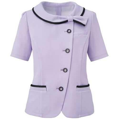 アシンメトリーの打ち合わせがオシャレな爽やかなボーダー柄のオーバーブラウス。柔らかい印象のリボン風デザイン衿は簡単に着用できるスナップボタン仕様。 |
