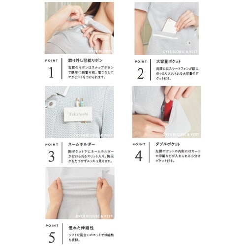 女性らしいカラーを織り交ぜたリズム感のある柄のオーバーブラウス。なめらかなニット素材なので着心地良く、高い吸汗・速乾性で一日中快適に過ごすことができます。 |
