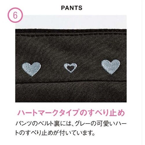 すっきり感ある梳毛ウール素材のピンストライプ柄のストレートパンツ。パンツのベルト裏には可愛いハートのすべり止めが付いています。裏地は通気性がよいメッシュ裏地を使用しています。 |