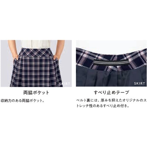 紺地にピンクやサックスブルーを入れたフェミニンで親しみのあるタック入りスカート。気品のある華やかさを演出でき、年間を通して快適に着用できます。前後4か所にタックを入れたフレアーシルエット。 |