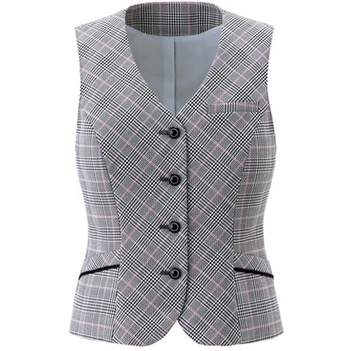 モノトーンにピンクのさし色を加えた優しい印象のグレンチェック柄のベスト。黒だけでなく、グレーのアイテムとも好印象。