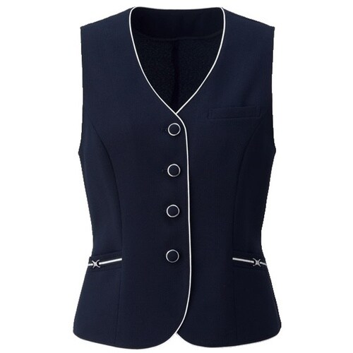 上質感のあるネイビーの無地素材に清潔感のある白いパイピングの入ったベスト。 |