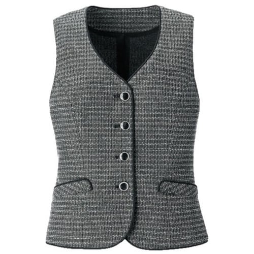 ツイード風の意匠性のあるニット素材のベスト。シワになりにくい機能性と耐久性があり安心して着用できます。後ウエストには腰高に見せるパイピングアクセント。 |