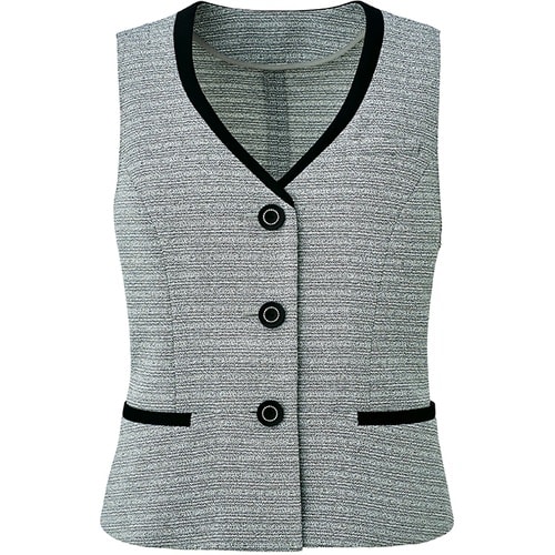 シルバーラメ入りサマーツイードのベスト。衿ぐり、ポケット口に濃色の生地を配し、全体を引き締めています。 |