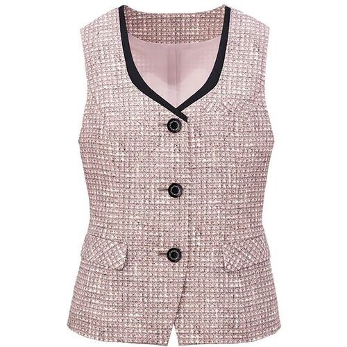 ツイード柄をプリントで表現した軽量ベスト。襟ぐりとボタンを黒にして引き締まった印象に仕上げました。後ろウエストには腰高に見せる切り替えライン。