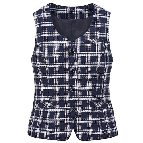 紺地にピンクやサックスブルーを入れたフェミニンで親しみのあるチェック柄の4つボタンベスト。気品のある華やかさを演出でき、年間を通して快適に着用できます。