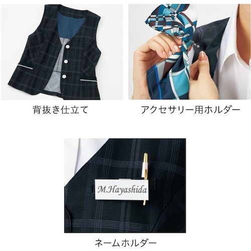 涼しげなチェックを重ねて奥行きのある柄を施した華やかな印象のニット素材のベスト。再生ポリエステルを使用したエコ素材で地球にも優しいアイテム。
