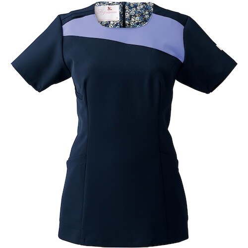 やや丸みをおびたスクエアネックと斜めに切り返された配色が印象的なオシャレなスクラブ。