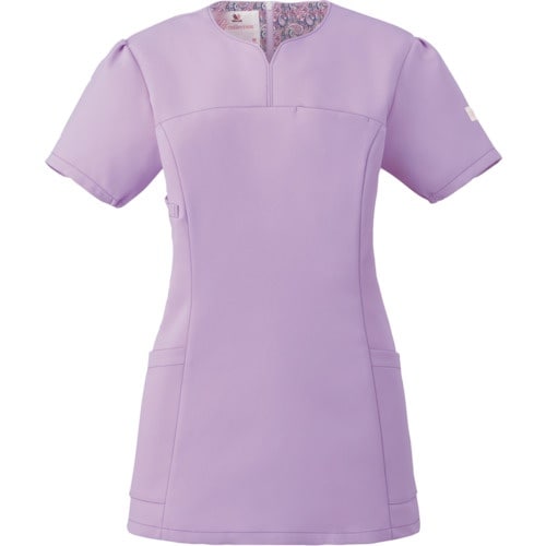 顔まわりをシャープにスッキリと見せてくれるハート型の襟元が特徴の、上品な女性らしいスクラブです。