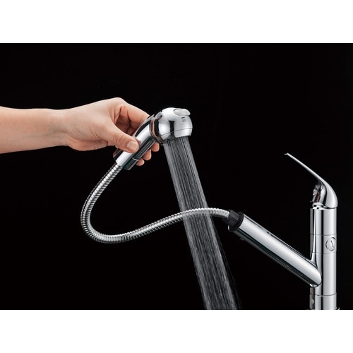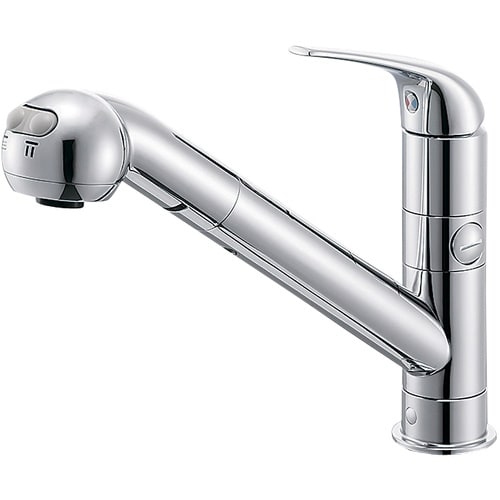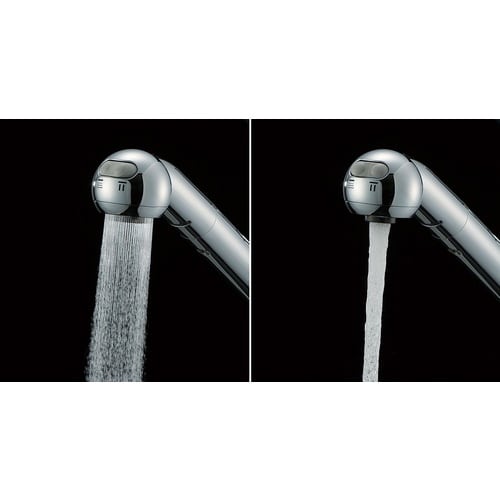 シャワー・泡沫切替ができます。吐水口120°回転です。分岐口付(湯水どちらも送水可能。分岐口は回転しません)。バルブを取り付ける際はアダプターPT209−13をご使用ください。 |