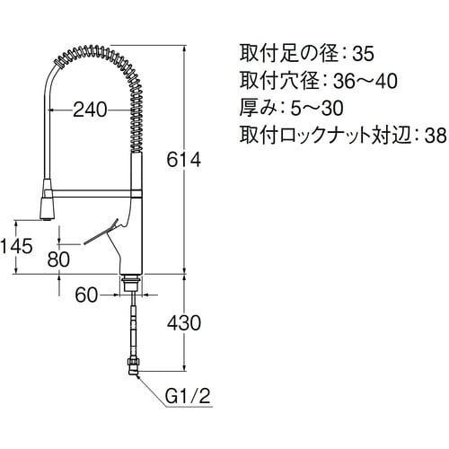 呼び径(mm):13 | 奥行(mm):240 | 高さ(mm):614 | 取付穴径(mm):36ー40 | タイプ:一般地用 | 取付ロックナット…