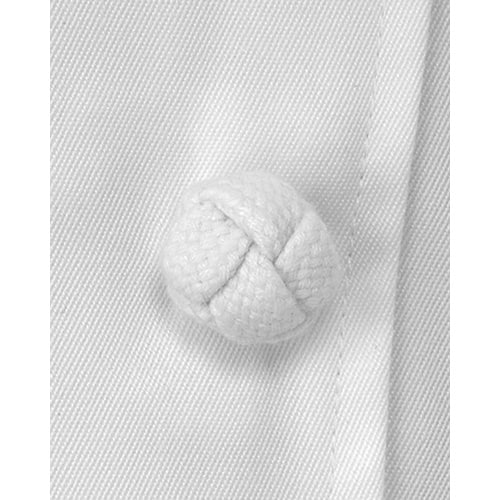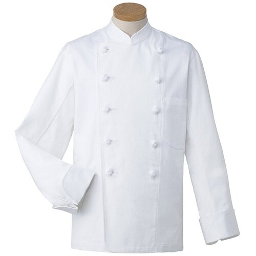 厨房現場で永く愛用されている定番の綿100%の[カツラギ]織り。丈夫で燃えにくいです。いざという時に、鍋つかみとして使える[袖口カフス]は伝統の中で生まれたプロ仕様。 |