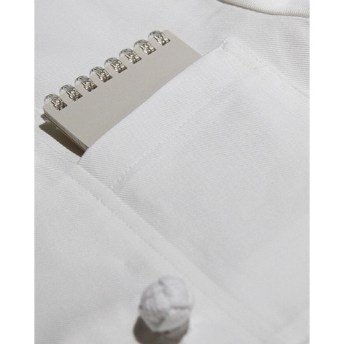 厨房現場で永く愛用されている定番の綿100%の[カツラギ]織り。丈夫で燃えにくいです。いざという時に、鍋つかみとして使える[袖口カフス]は伝統の中で生まれたプロ仕様。 |