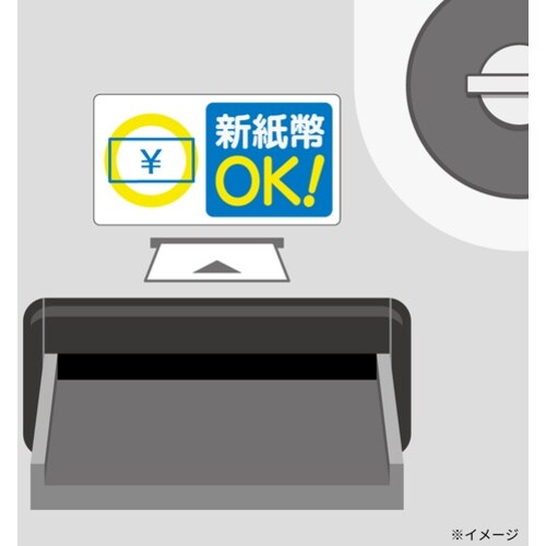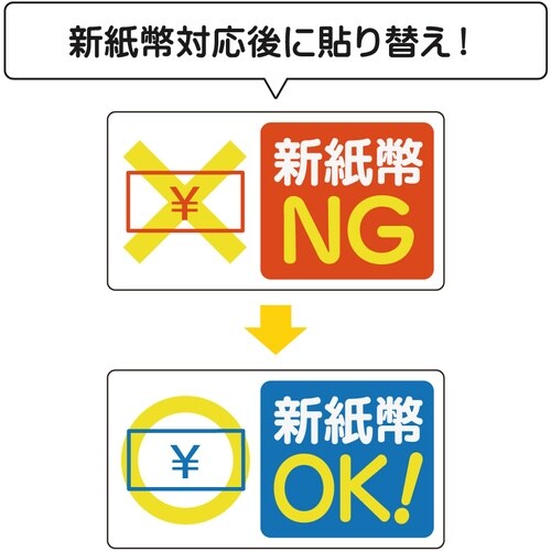 1シートに対応・非対応の2種類があるので、状況に合わせて貼り替えができます。無人レジ周りや券売機などに貼ることによって、新紙幣に対応しているか確認できます。 |