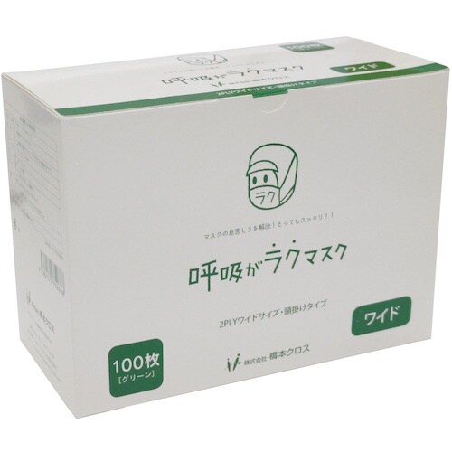 橋本クロス 橋本 呼吸がラクマスク ワイドサイズ 2層・頭掛け グリーン 100枚×30箱 KR2WHG 1箱(3000枚) A050-4907